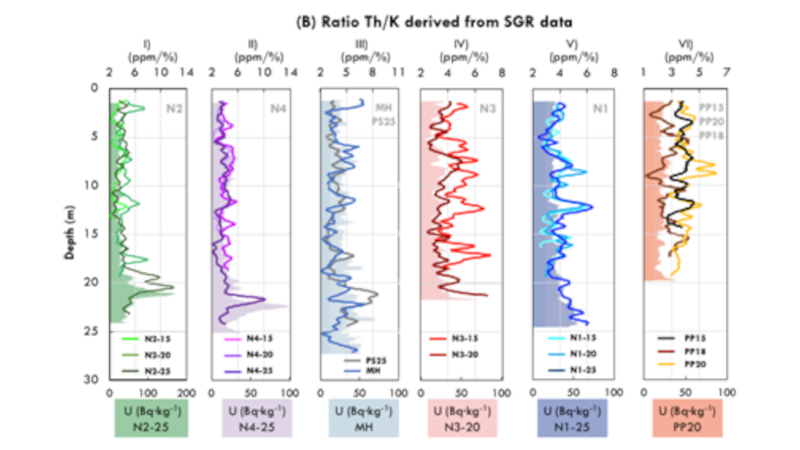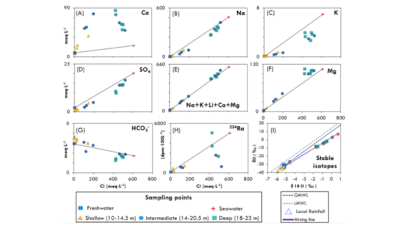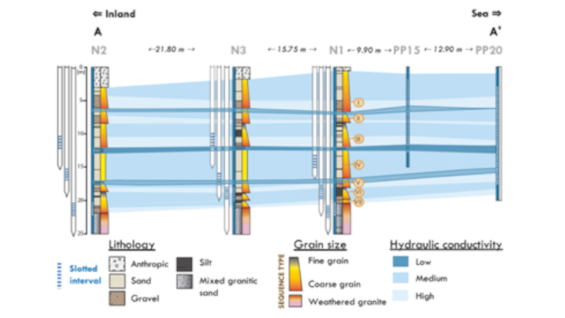 This approach identified the aquifer hydraulic and geochemical controlling parameters and their impact on groundwater flow and more specifically, on the fate and transport of radioactive nuclides used to quantify submarine groundwater discharge. The analysis revealed the presence of a high reactive layer in the bottom of the aquifer charaterized by high U content and a huge geochemical activity in the mixing zone mainly represented by ion exchange.