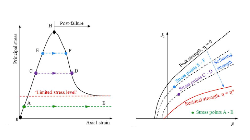 This study provides a general numerical approach for predicting longitudinal deformation profiles using a coupled ViscoElastic-ViscoPlastic Strain-Softening (VEVPSS) model. The proposed method is able to consider the coupling between post-failure behaviour and time-dependent behaviour, thus providing a new alternative method for preliminary tunnel design. A viscous dashpot and the strain-softening model are coupled to simulate the progressive damage process and creep failure behaviour of rock masses. The tunnel deformation based on the VEVP-SS model is larger than the corresponding elastic–plastic results due to the contribution of the creep behaviour, and the excavation rate becomes relevant when considering time-dependent behaviour. (PI: Alfonso Rodríguez-Dono)