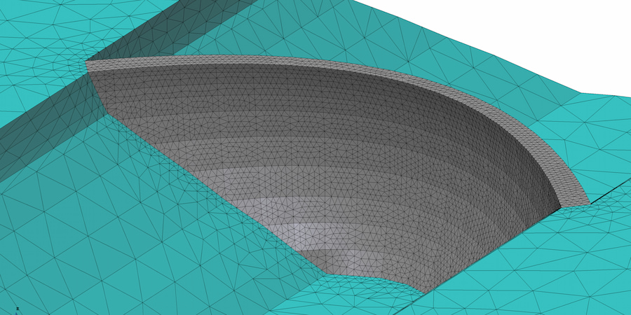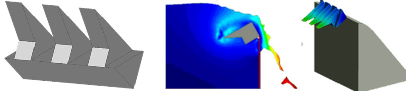 Fuse gates simulation: geometry design (left), fluid-solid interaction 2D simulation (center) and 3D simulation (right)