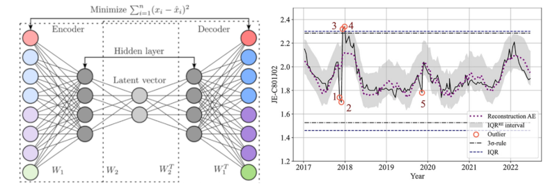 Autoencoder structure (left) and detection of anomalous monitoring data (right). Source: https://doi.org/10.1007/s13349-025-00910-4.