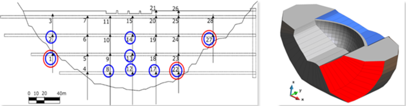 Anomaly detection in dams: example of monitoring network (left) and numerical model to simulate anomalous events (right). Source: https://doi.org/10.3390/w13172387
