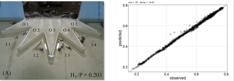 Spillway hydraulic performance: example of geometry (left) and relationship between observed and predicted values from ML models of discharge capacity. Source: https://doi.org/10.3390/w11030544