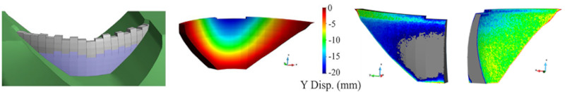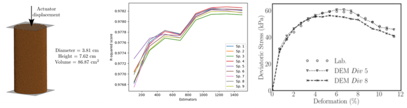 Calibration of DEM parameters of clay behavior: numerical model to simulate clay behavior tests (left), and calibration analysis through ML (center and right). Source: https://doi.org/10.1007/s40571-022-00550-1