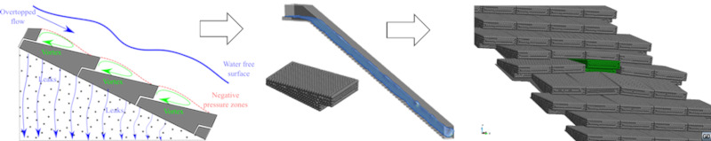 Wedge shaped block spillways simulation: hydraulic analysis (left), block design (center) and block stability analysis (right)