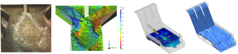 CFD analysis of hydraulic structures: highly convergent spillways (left) and stilling basin simulation (right)