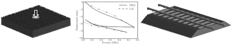 Railway infrastructure simulation: ballast behavior simulation (left), calibration analysis (center) and railway infrastructure simulation (right)