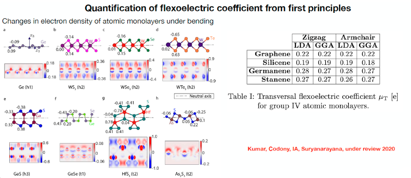 An emerging research area is the theoretical and computational modeling of flexo-photovoltaics, aiming to design and optimize a new family of solar cells by understanding the interplay between mechanical deformation and photovoltaic properties. Through this diverse research portfolio, the group advances the fundamental understanding of electroactive materials while exploring their potential for innovative engineering applications.
